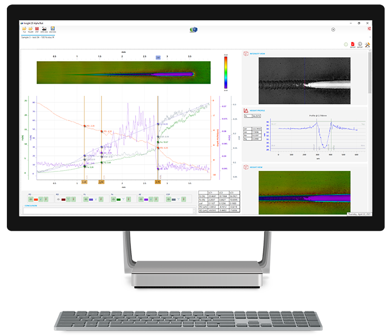 - Запатентованная корреляция изображений между данными скретч-тестов и 3D-изображениями;