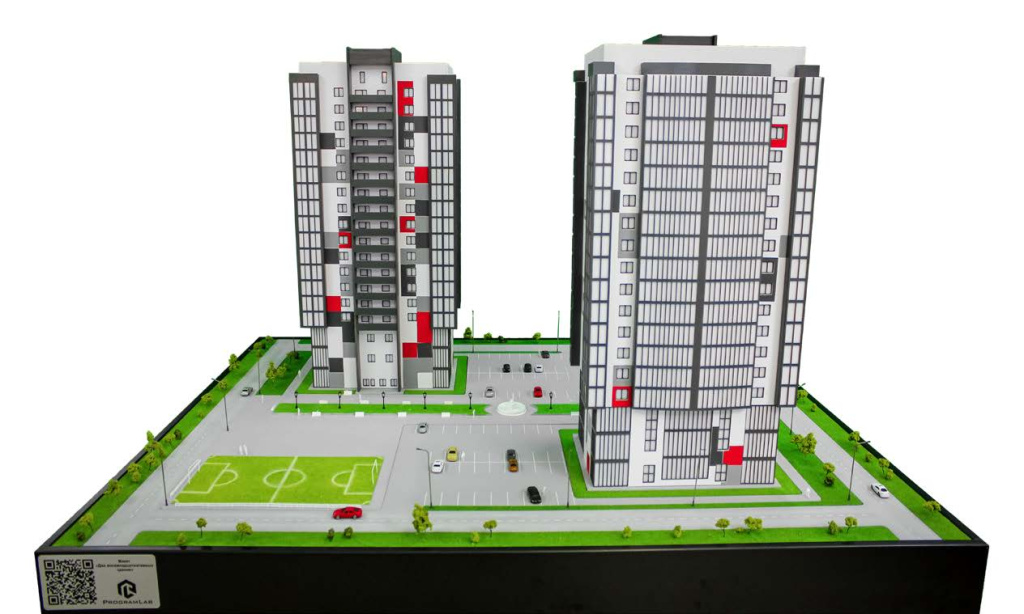 Специализированное наглядное пособие, в котором реализованы макетные модели, являющиеся аналогами реального жилого комплекса из двух 18-этажных зданий.