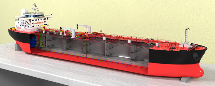 Макет нефтяного танкера класса Aframax (аналогичный танкеру Залив Америка или другой) с прозрачным исполнением корпуса в районе нефтяных танков для изучения конструкции и общего устройства специальных систем танкера. На данном макете представлено общее расположение трубопроводов и устройств, входящих в перечень специальных систем танкеров.