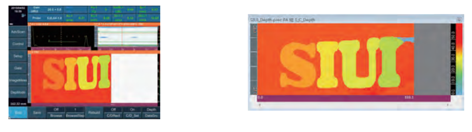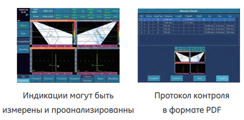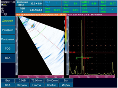 Отображение формы сигнала и информации (угол, ход луча, амплитуда и глубина) для любых позиций на скане, могут быть отображены в реальном времени. Результаты измерения и изображения индикаций могут автоматически сохраняться в виде протокола.