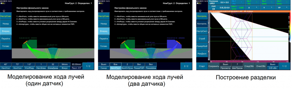 - Для одновременного сканирования можно использовать несколько групп под разными углами, покрывая всю область сварного шва и повышая эффективность контроля.