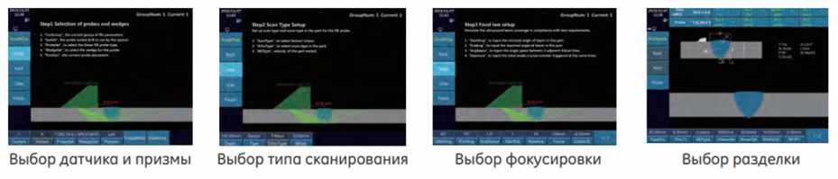 - Пошаговая настройка выбора датчика и призмы к нему, типа сканирования, фокусировки, разделки позволят быстро настроить прибор для контроля труб малого диаметра со сканерами серии LPS.