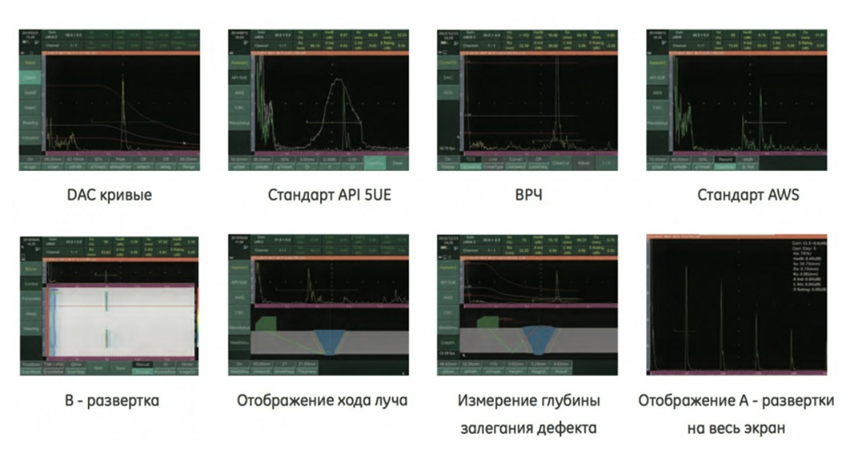Дополнительные функции: Стандарт API/ ВРЧ/ Стандарт AWS/ Корректировка на криволинейную поверхность / Спектральный анализ / B-скан/ Отображение хода луча/ Измерение глубины залегания дефекта.
