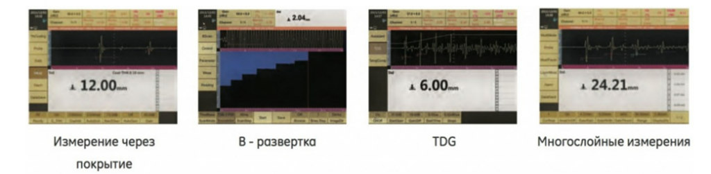 Дополнительные функции: построение B-скана, измерение через покрытие, измерение многослойных объектов контроля, TDG, температурная компенсация и другие.
