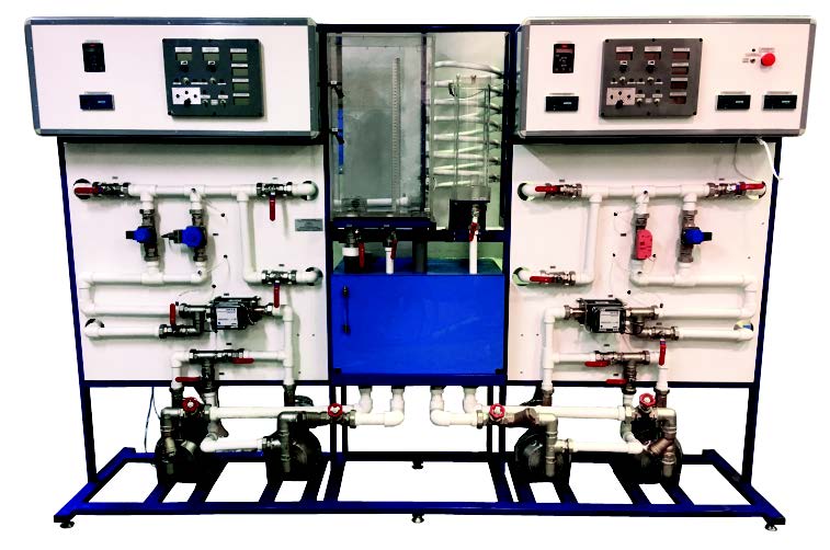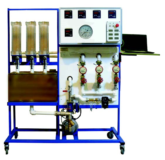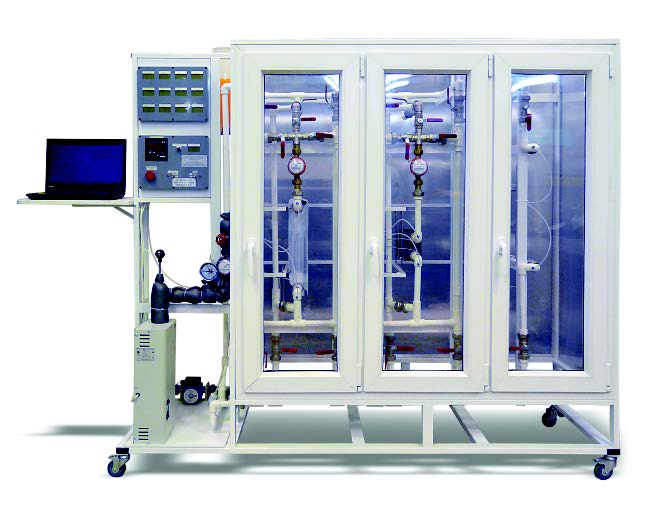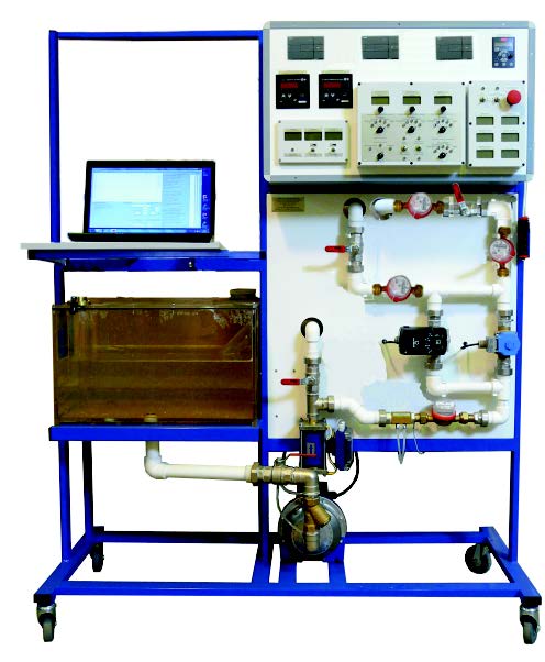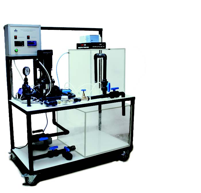 Питание потребителя осуществляется от насоса с установленным на выходе насоса счетчиком количества воды и датчиком давления. Насосный агрегат имеет частотную регулировку подачи жидкости. Питание насоса осуществляется от технологической емкости-бака, установленного на стенде, объем бака 60 л. гидравлическая система замкнутая.